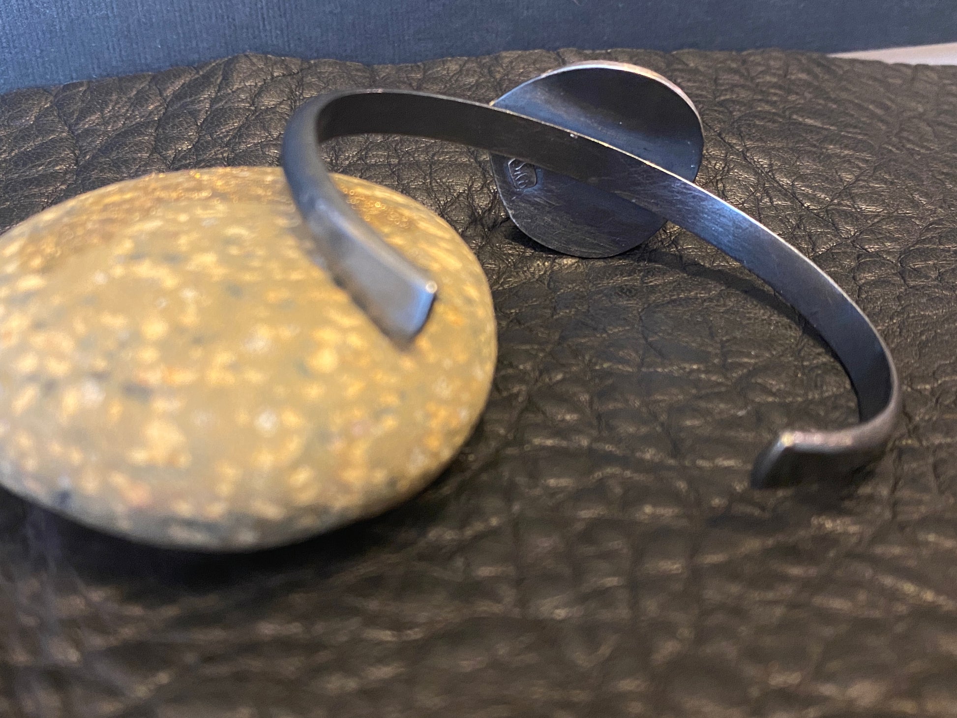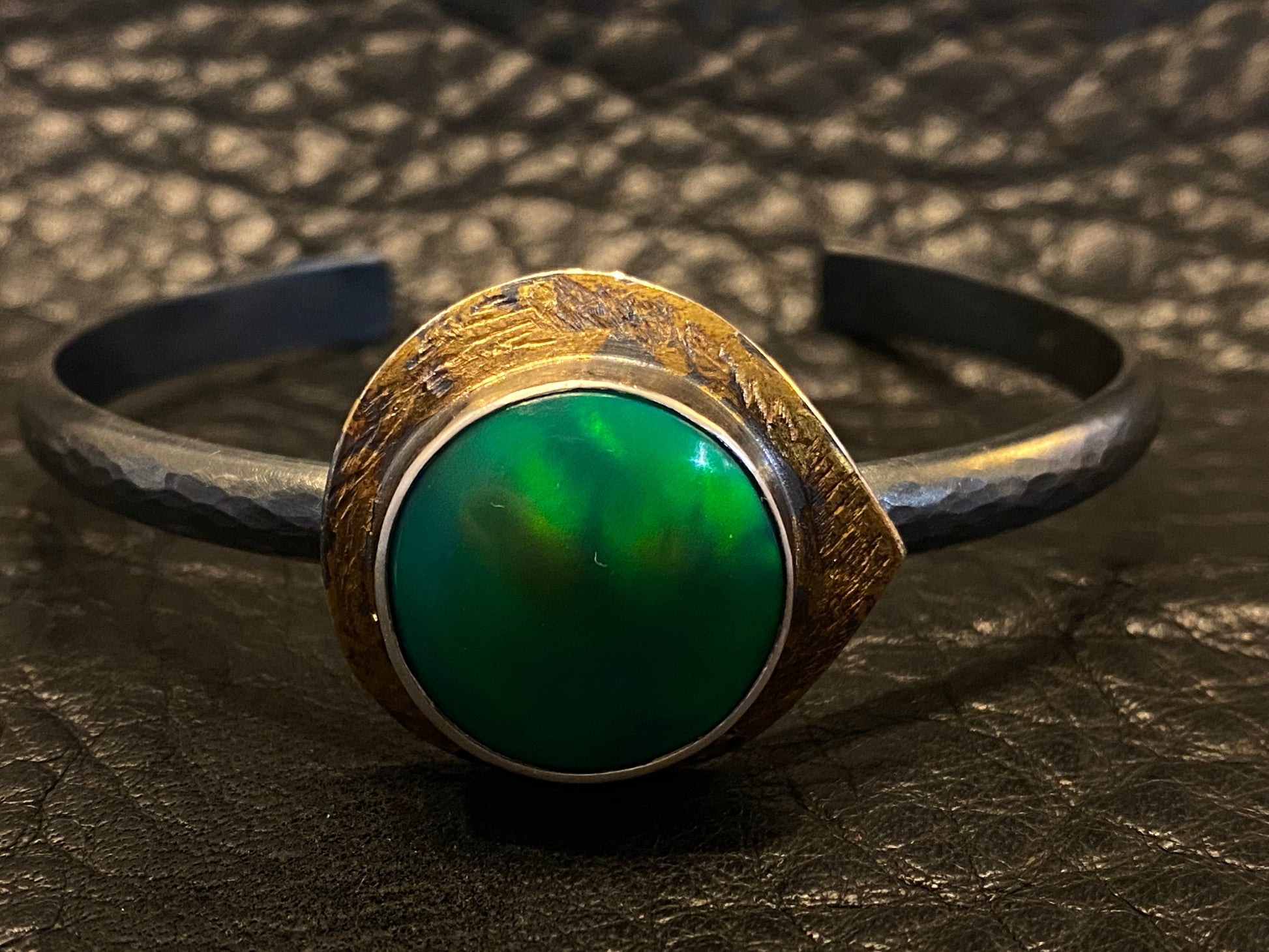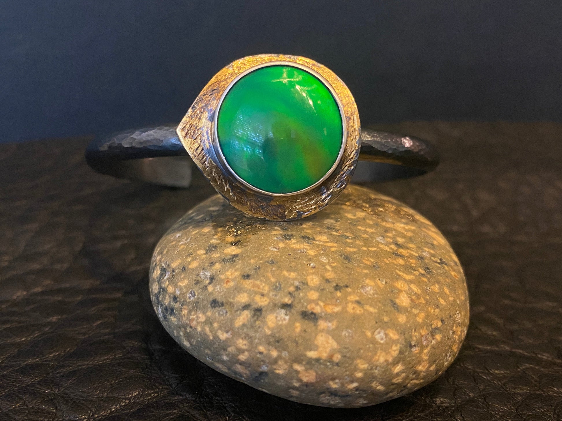 Next level green Aurora Opal adorned by dark oxidized silver and 24k gold Keum-Boo - a traditional Korean gilding technique.