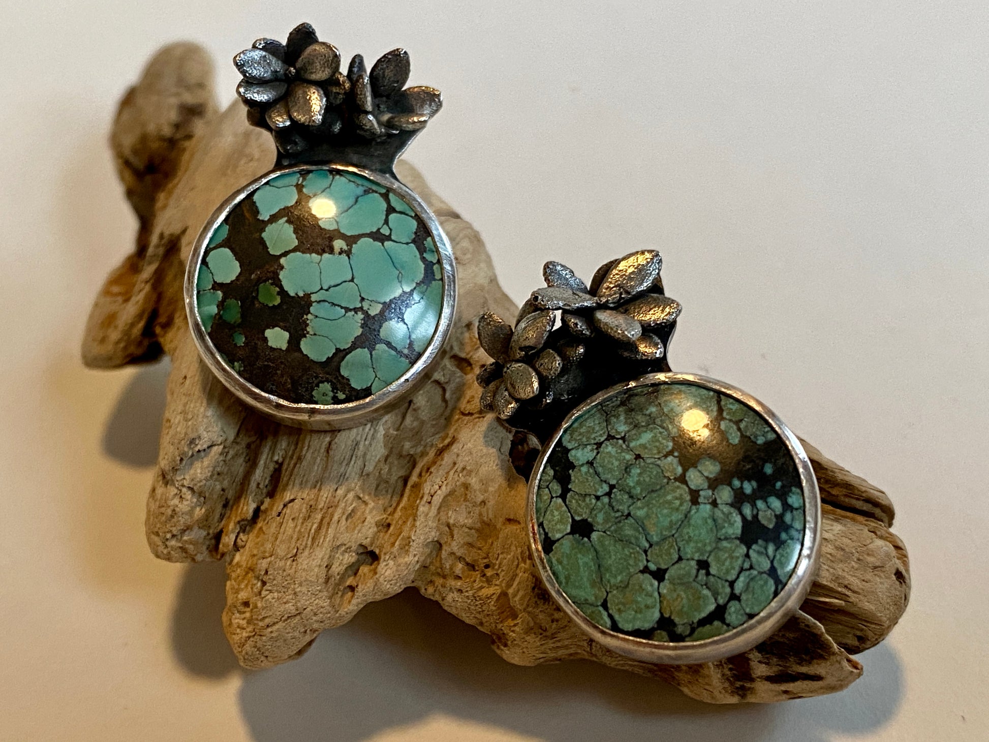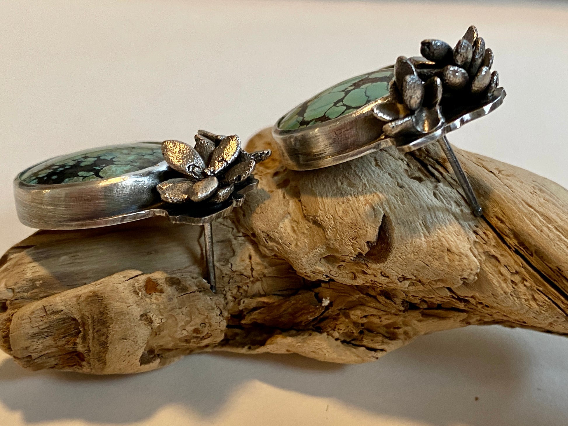 These beauties are one of kind! Yungai Turquoise and hand picked succulents cast in sterling silver and oxidized for a gentle worn look.