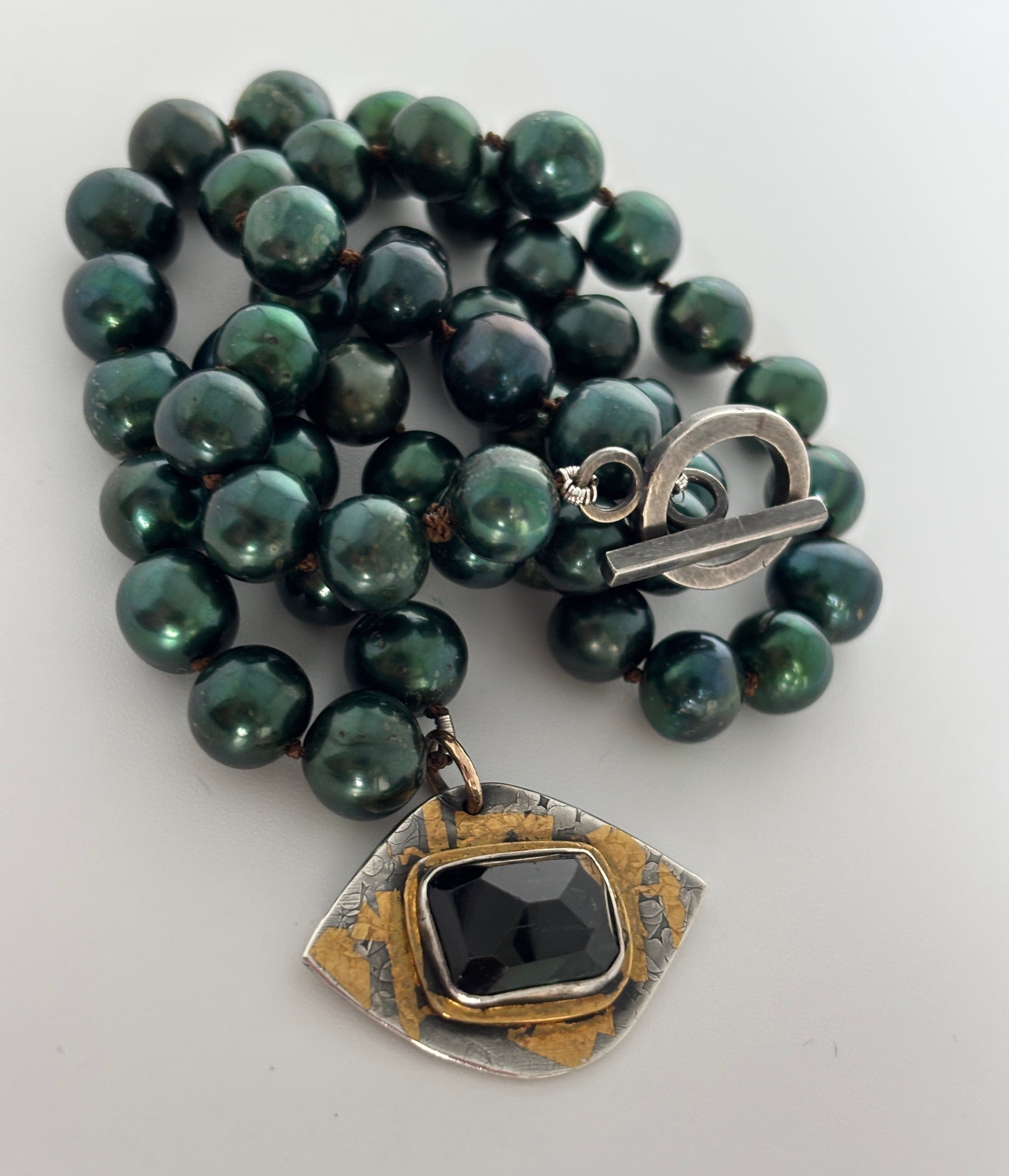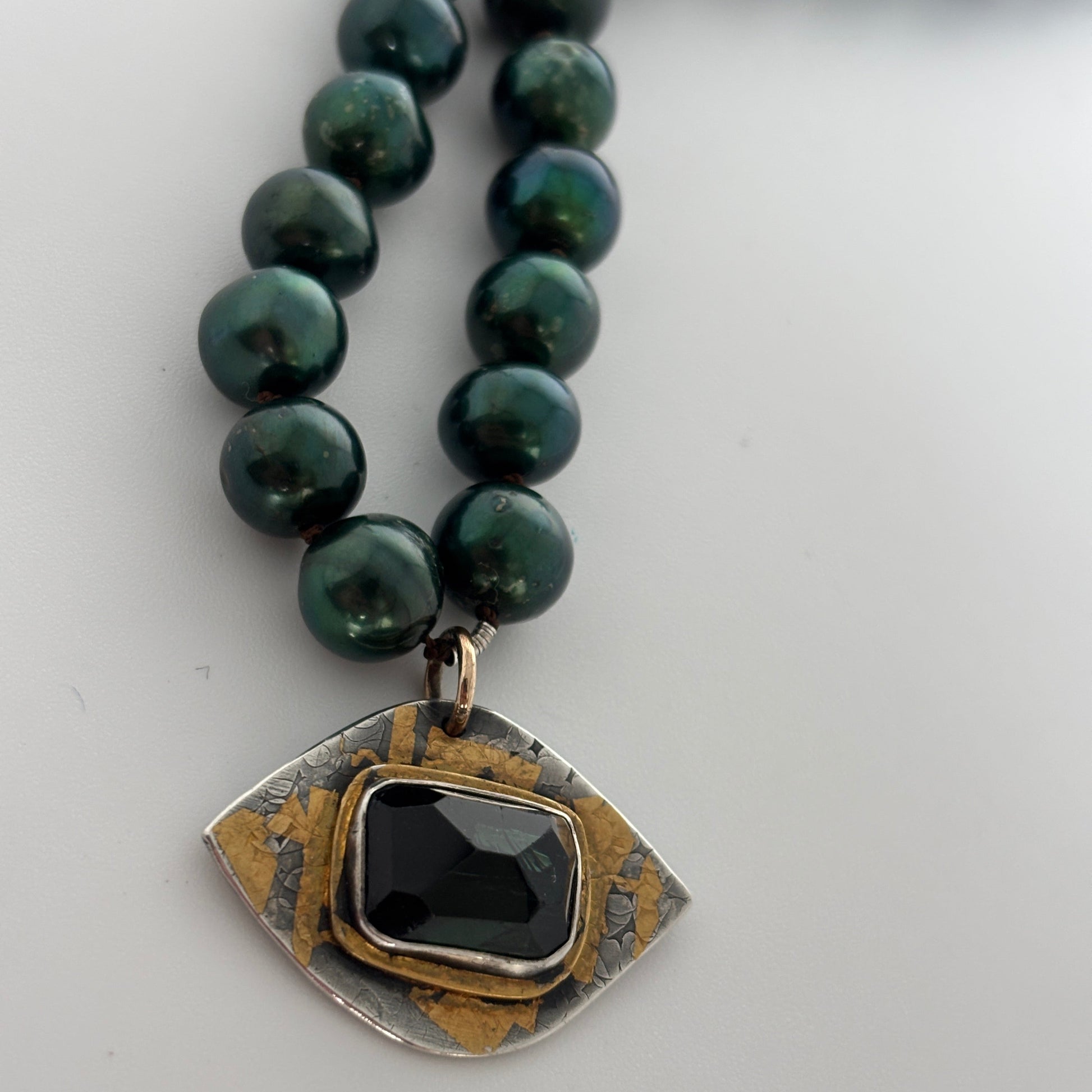 Lustrous emerald green pearls, hand-knotted on black silk, lead to a striking tourmaline pendant set in hand-textured sterling silver and dressed with 24k gold Keum-Boo (Korean gilding technique) and finished with a handcrafted silver toggle clasp. This piece evokes vision, protection, and grounded elegance.
