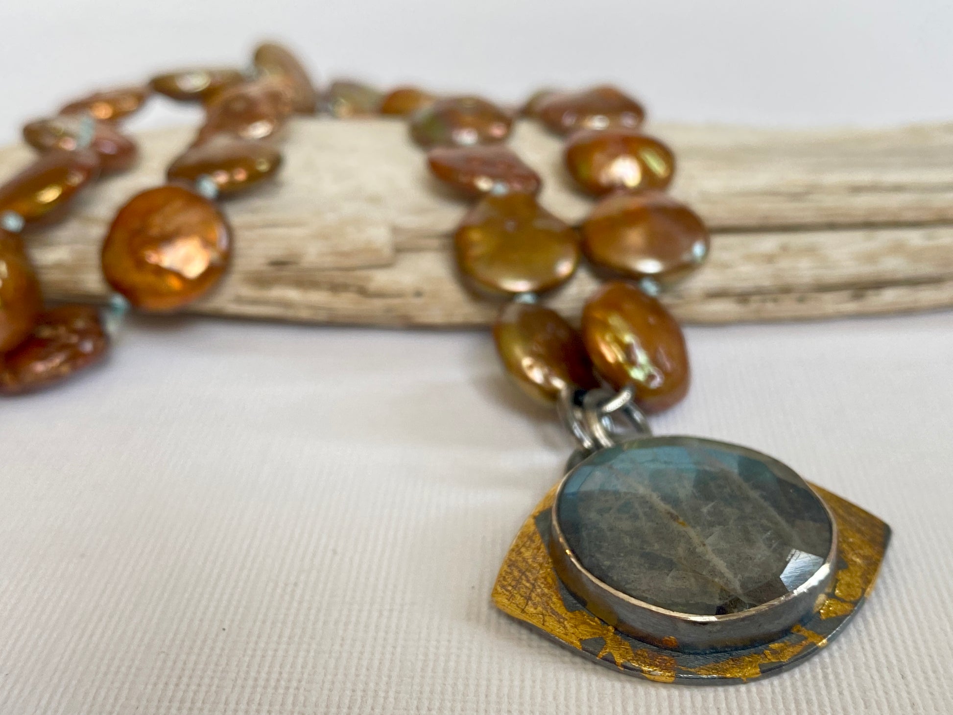 Golden-copper freshwater pearls | icy blue silk thread | labradorite | keum-boo gold | sterling silver | handmade clasp