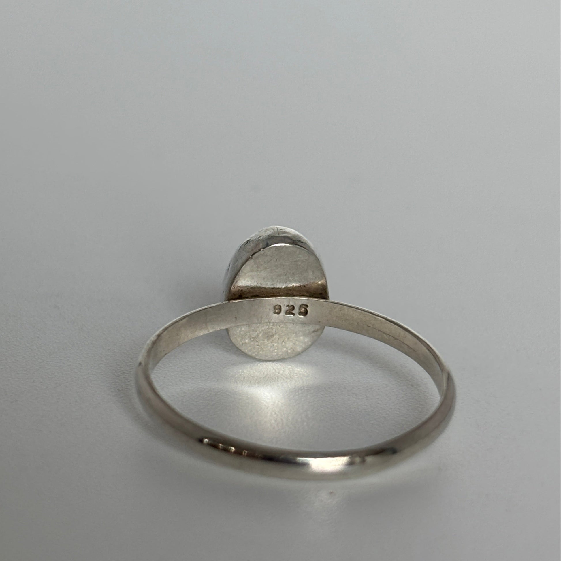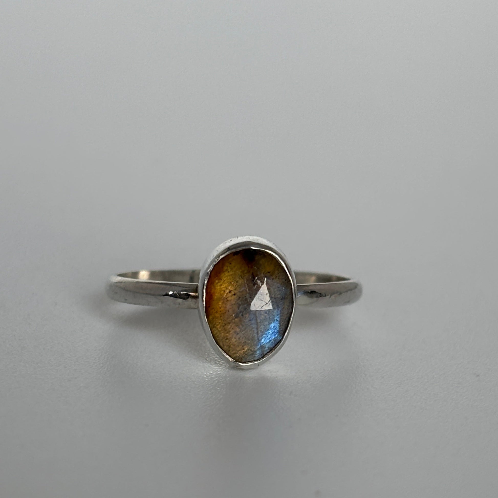 Beautiful on it's own or stacked with friends. Single faceted labradorite on simple half-round sterling silver band.