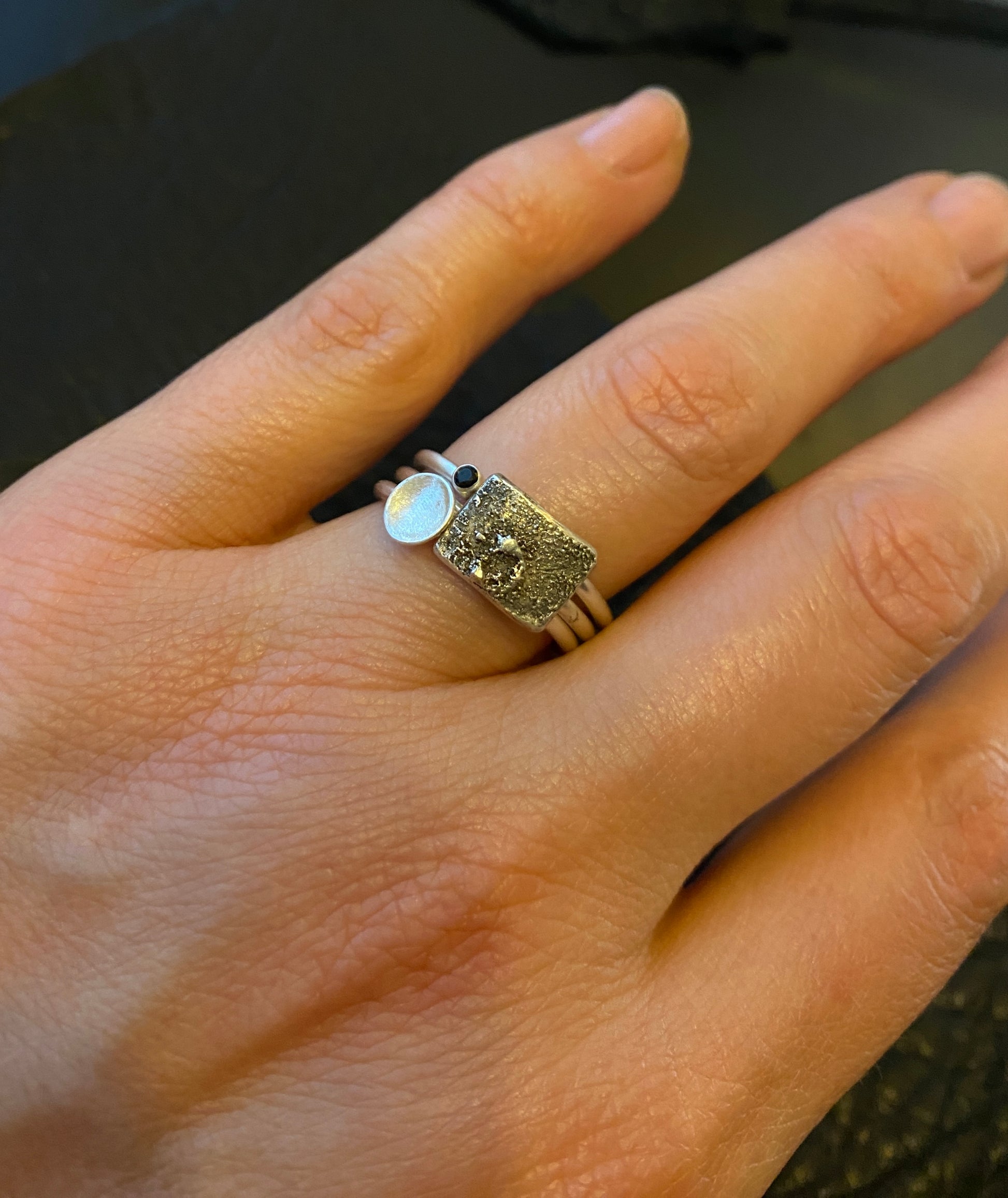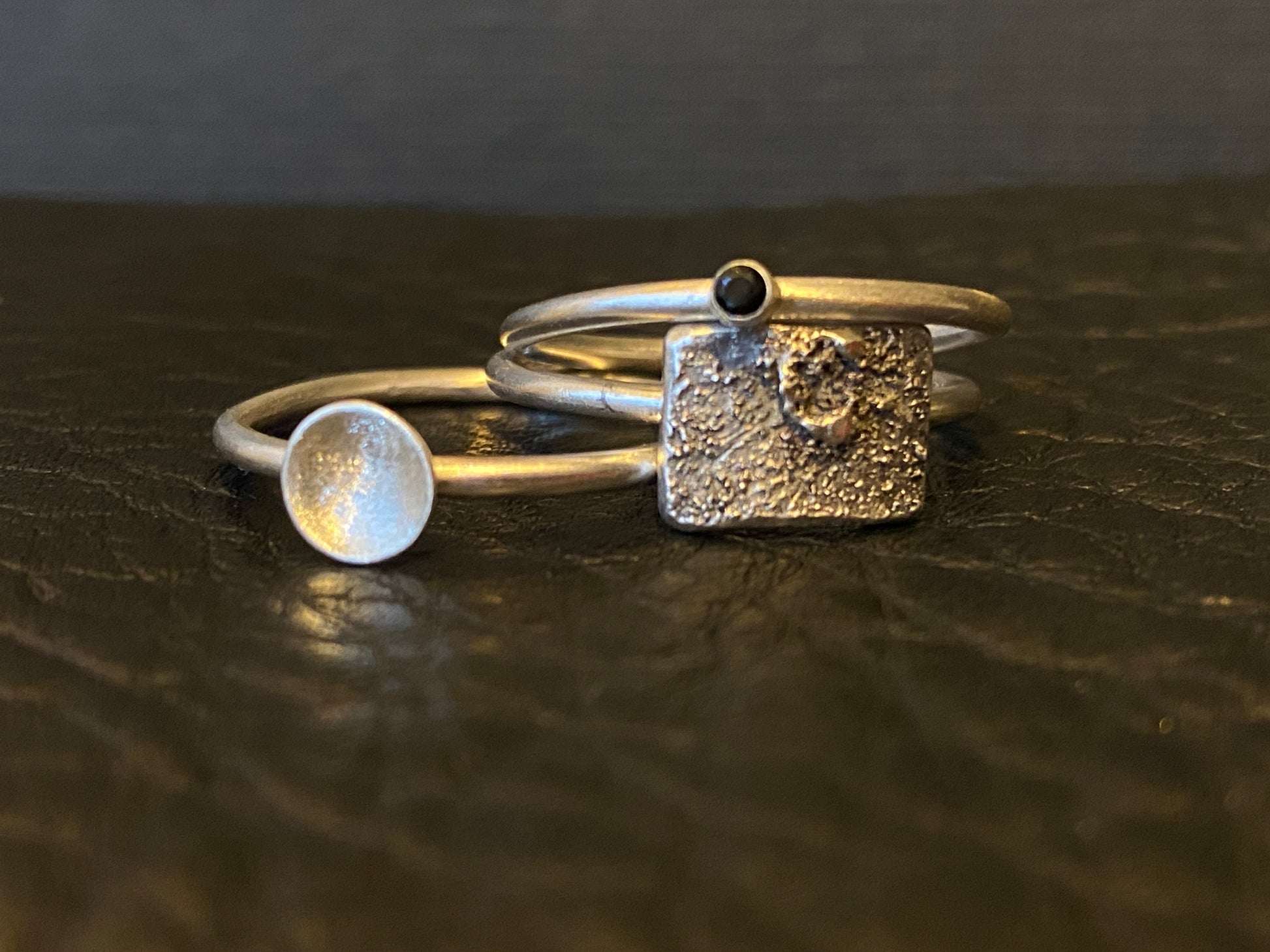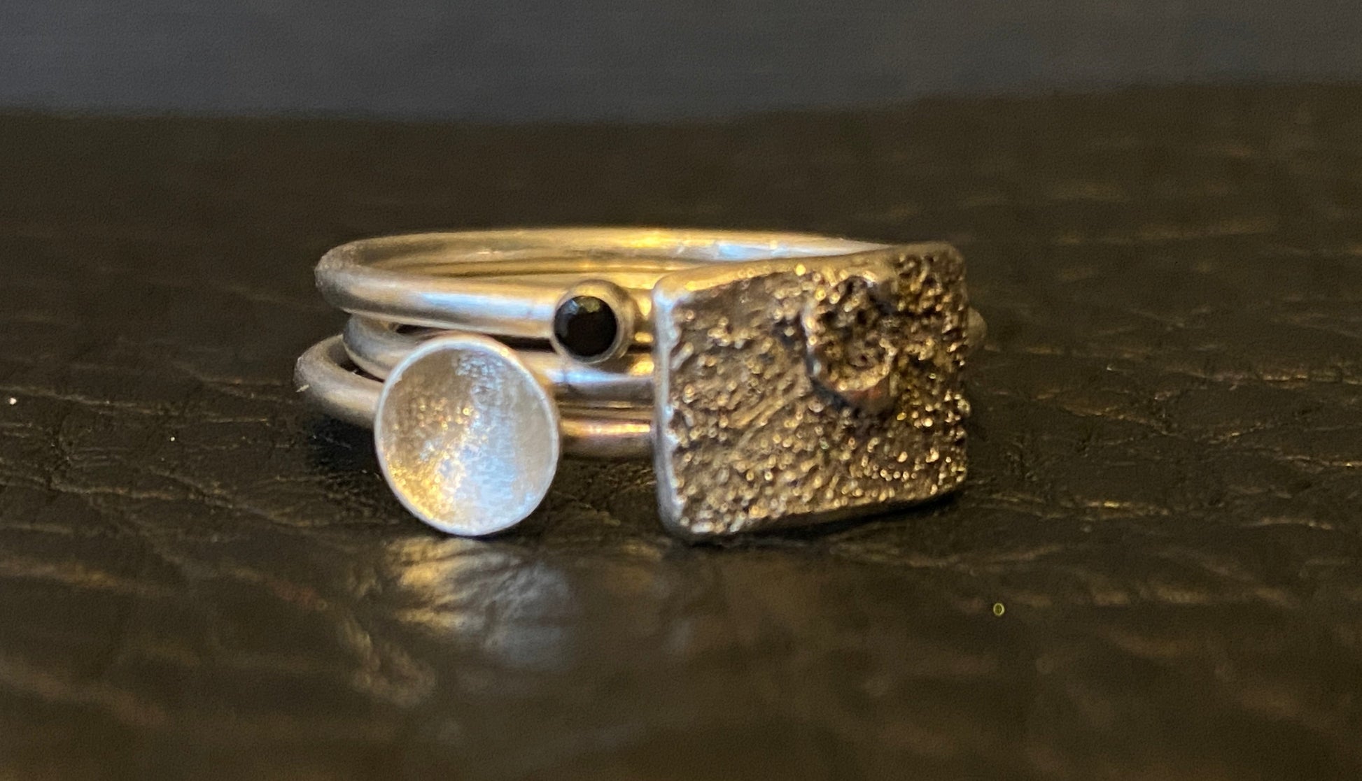 Triple stack textured and adorned with black cubic zirconia and fine silver dust.