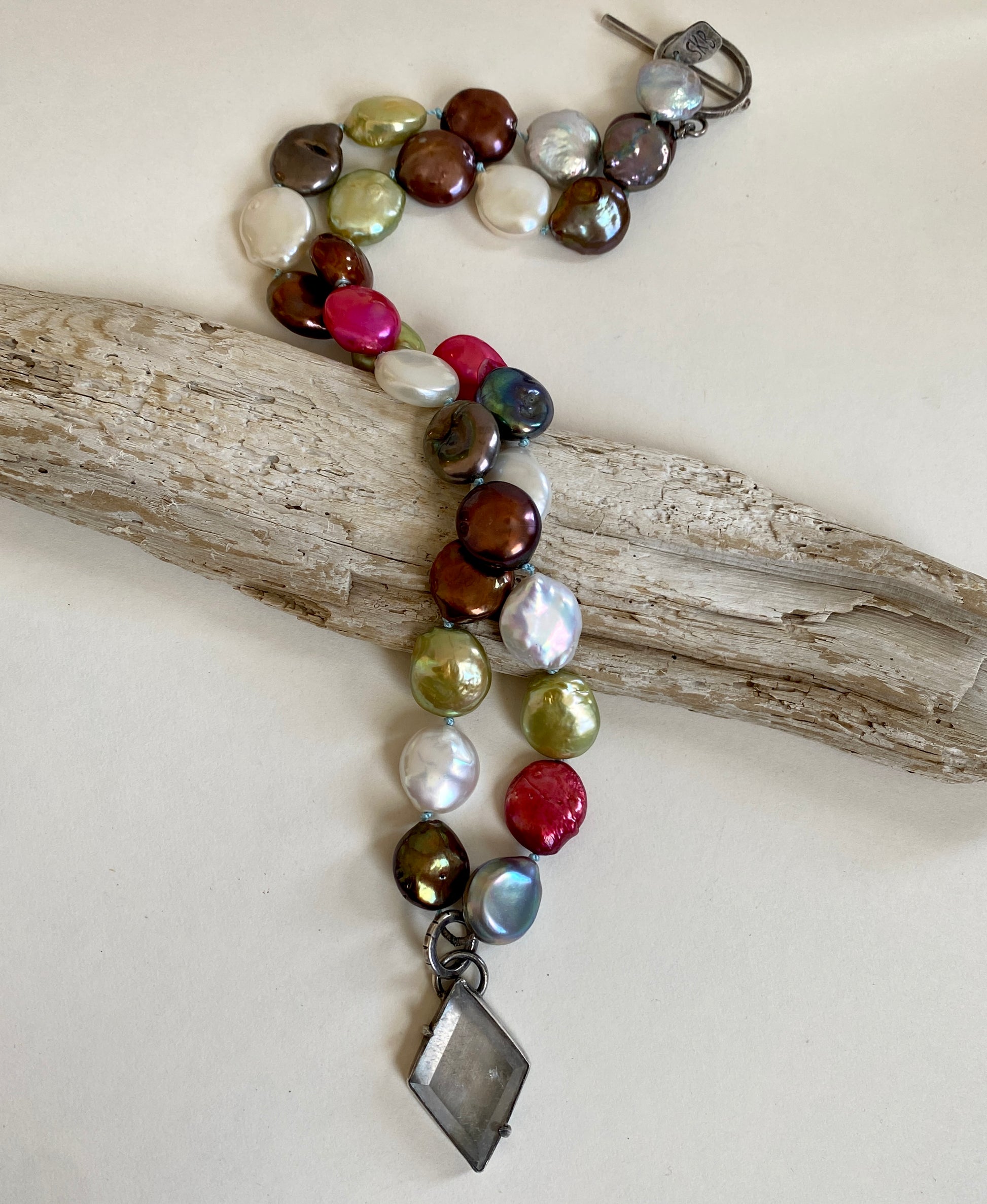 Multi-color freshwater pearls (appx. 12mm coin shape) hand knotted on light blue silk. This necklace features a diamond shaped quartz charm set in oxidized silver with two prong accents for a dark, edgy finish.