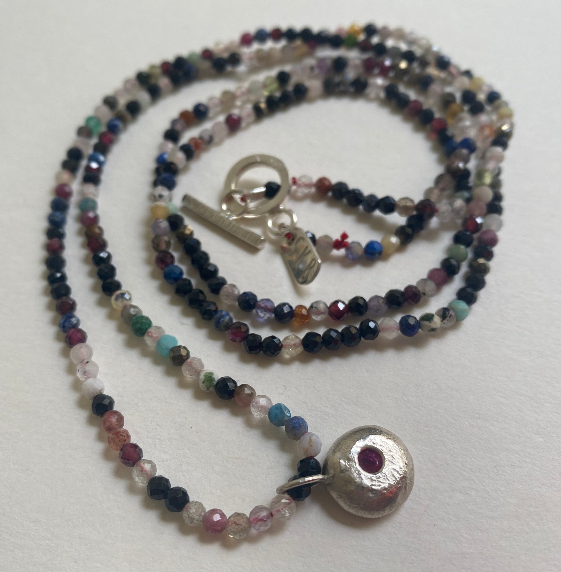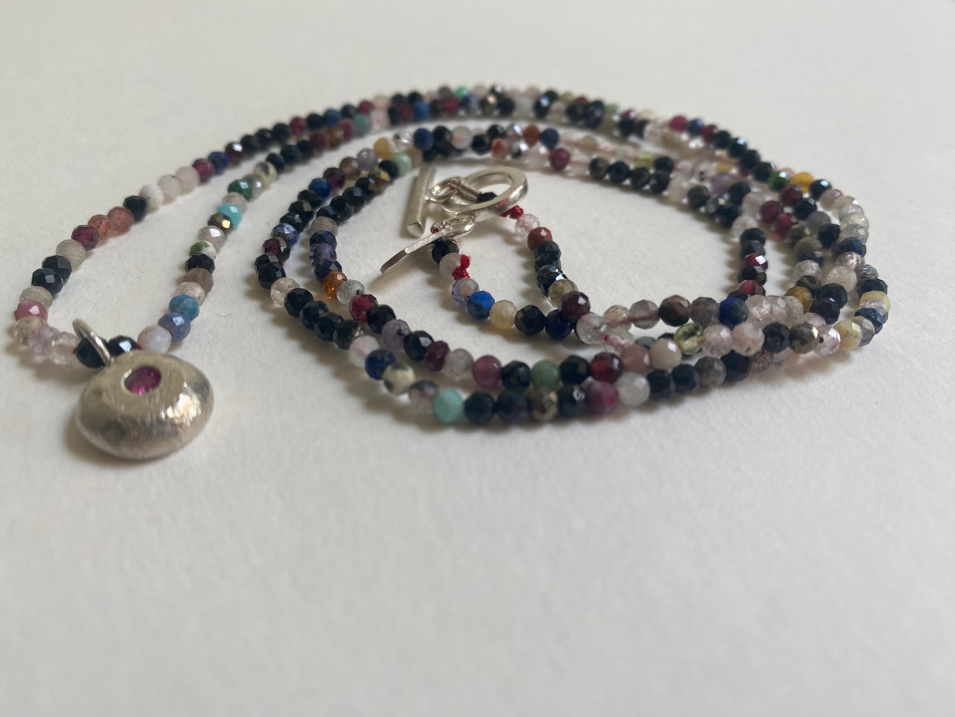 Sparkling CZ flush set in sterling silver hangs upon a string of colorful gemstone beads with a handmade toggle clasp. Perfect for wrapping and/or layering with your favorite pieces.