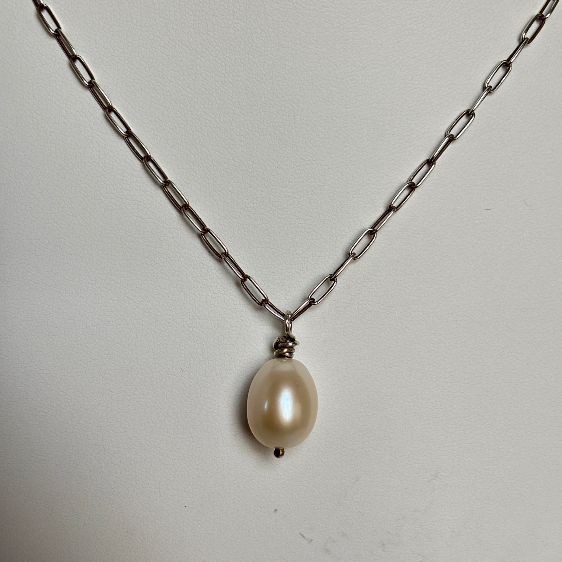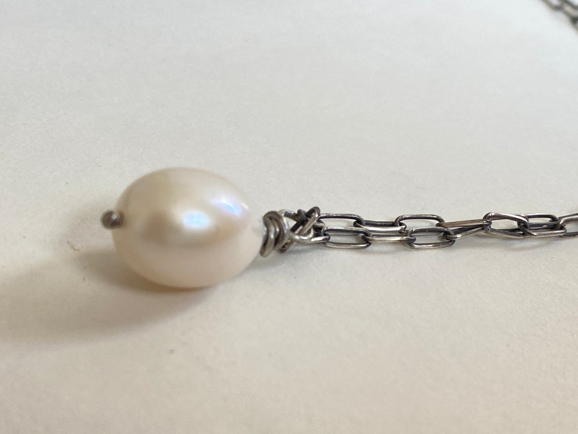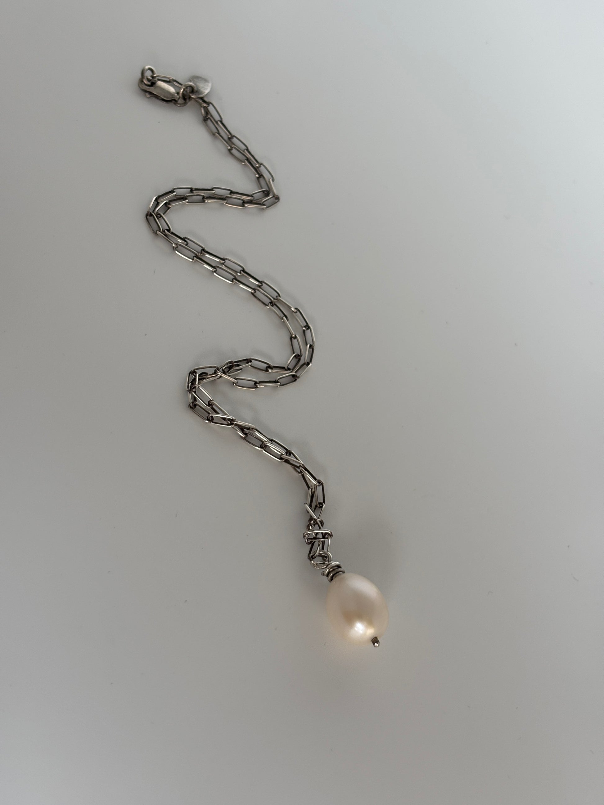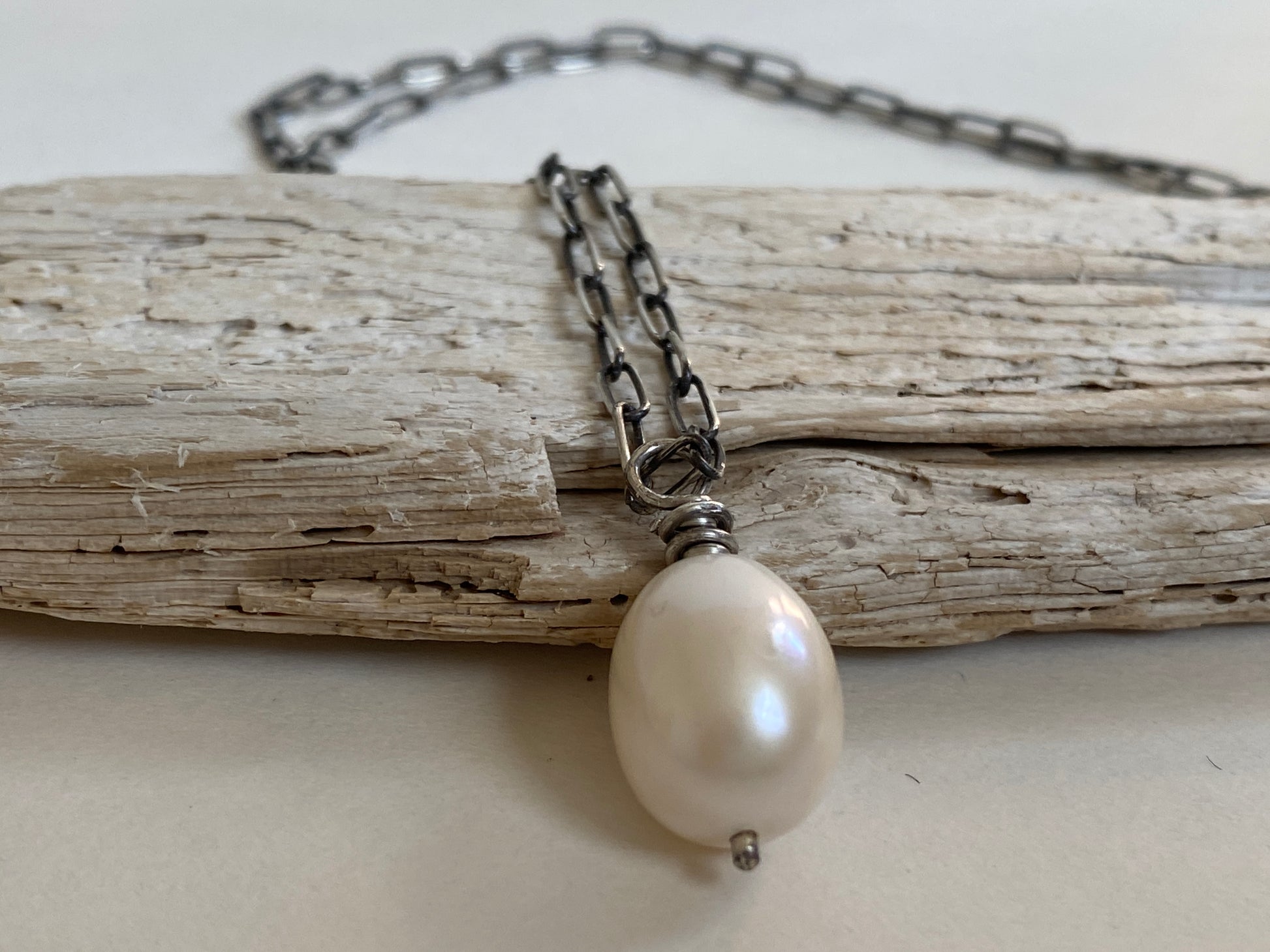 AAA natural white solo pearl on oxidized paperclip link silver chain.
