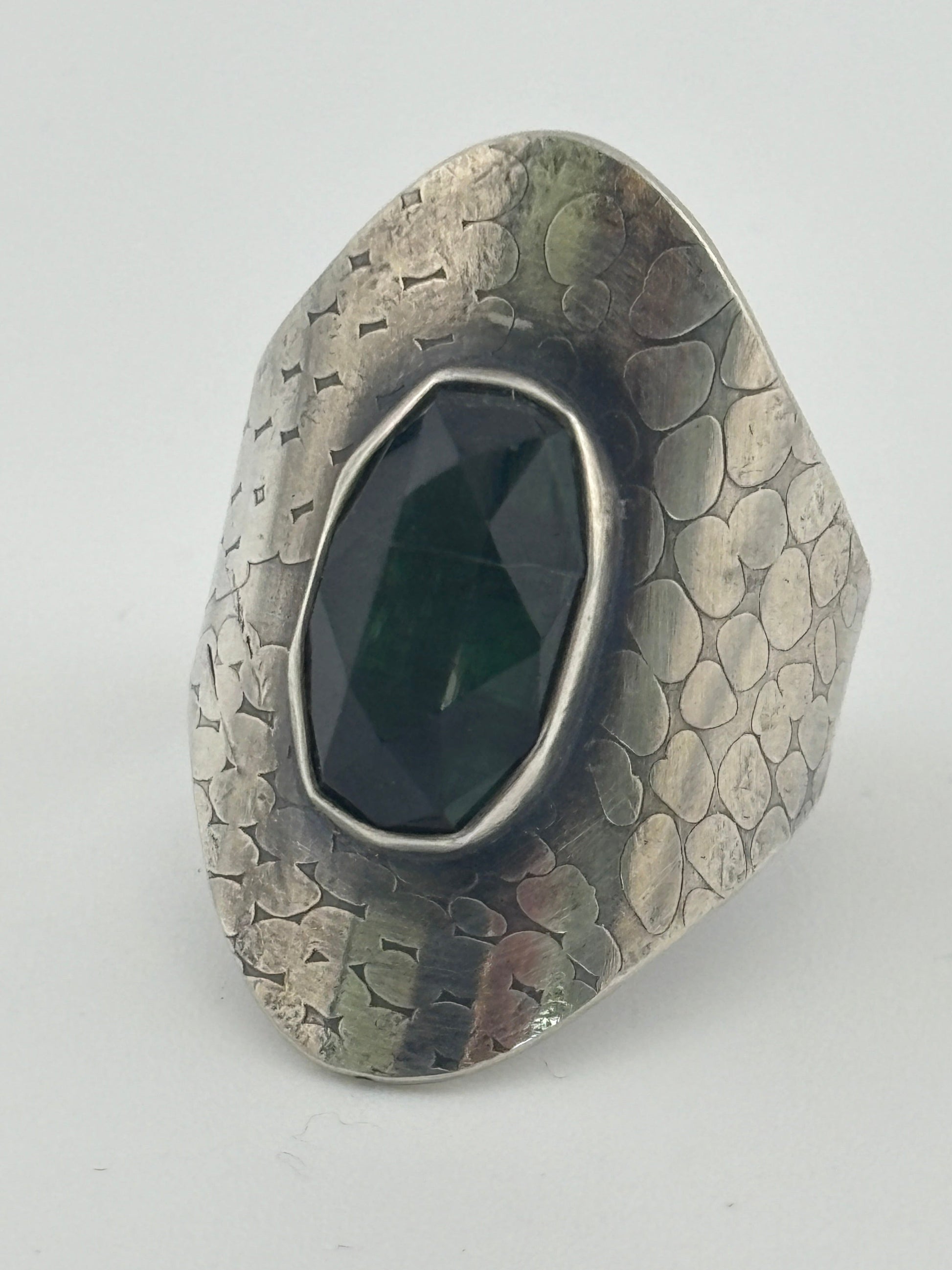 Sterling silver shield with lightly oxidized snake imprint envelops a dark green faceted tourmaline.